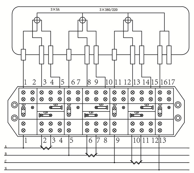 電度表接線(xiàn)盒A、B、C相線(xiàn)及中性線(xiàn)N均帶保護(hù),一般用在額定電壓3×100/57.7