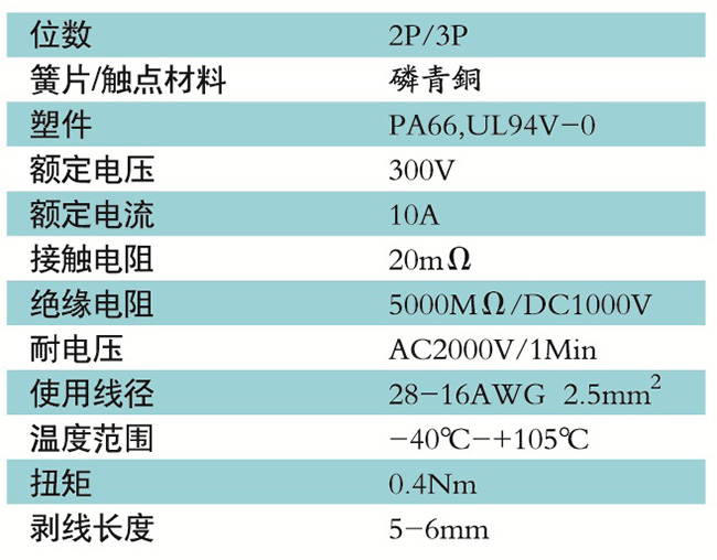 接線端子的絕緣材料用改性的尼龍(PA66),能達到或超過IEC947-7-1EN60947-7-1標準,阻燃等級達到UL94V-0具有良好的電氣性能和機械性能。螺絲用高強度的鋼制成鍍鋅或鎳處理,導電體四方針用合金銅制成表面鍍錫,壓片采用彈性及極強的磷青銅表面鍍錫或鎳;壓線框用抗應力裂縫腐蝕的合金銅制成,這些金屬表面還鍍錫或鍍鎳加以保護。設計完全符合IEC60947-7-1.GB14048.7等標準。
