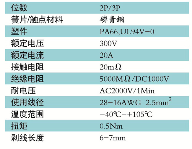 接線端子的絕緣材料用改性的尼龍(PA66),能達到或超過IEC947-7-1EN60947-7-1標準,阻燃等級達到UL94V-0具有良好的電氣性能和機械性能。螺絲用高強度的鋼制成鍍鋅或鎳處理,導電體四方針用合金銅制成表面鍍錫,壓片采用彈性及極強的磷青銅表面鍍錫或鎳;壓線框用抗應力裂縫腐蝕的合金銅制成,這些金屬表面還鍍錫或鍍鎳加以保護。設計完全符合IEC60947-7-1.GB14048.7等標準。