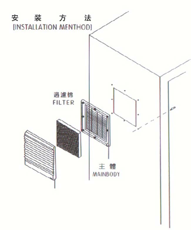 過濾器的塑膠材質為阻燃ABS樹脂,他具有抗紫外線及靜電的優點,過濾網選用進口的尼龍纖維全順民料,除塵率達88%,有效的阻止粉塵進入控制柜內部,而影響電氣原件的使用壽命。 通風口采
